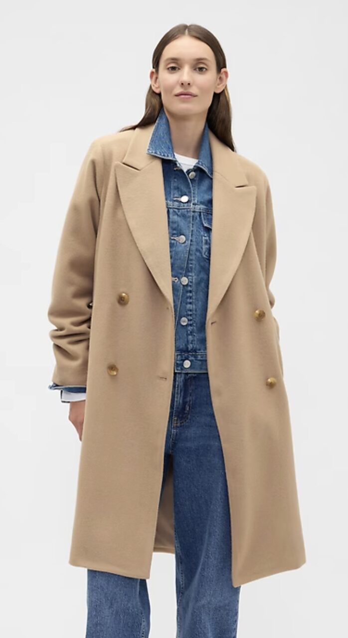 A soft-knit, camel-hair-brown women’s topcoat is a stylish yet affordable layering piece!