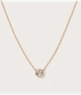 I am in love with this tiny diamond necklace. The diamond is real, the chain is exceptional quality and it goes with everything and will last forever. Perfect for the hard to buy for woman. Comes in yellow gold and white gold.
