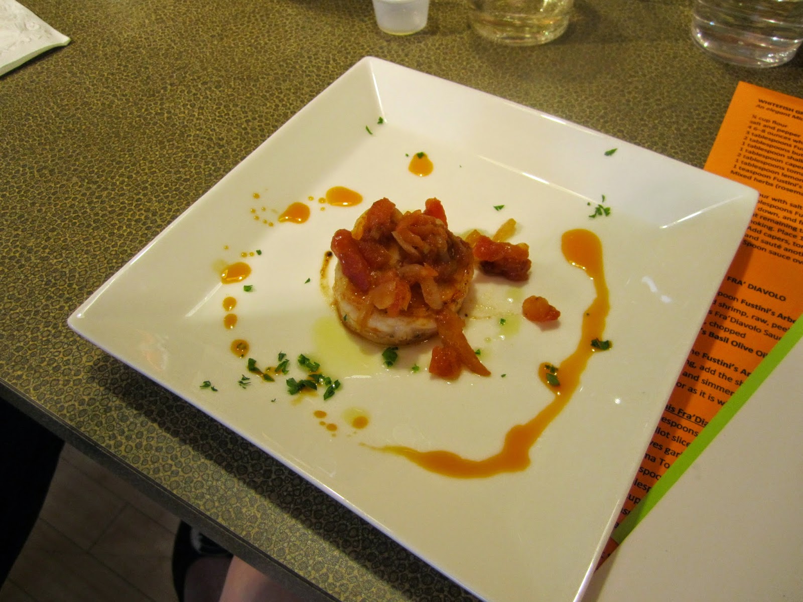 Chef Andy’s dishes were no exception…they were all excellent. Our menu consisted of Crab Stuffed Peaches, Parmesan Crusted Tilapia, Whitefish Grenoble, and Shrimp Fra’Diavolo. While I thought the crab dish was the one I was going to like the least (crab and peaches just didn’t seem to go together in my mind), it ended up being my favorite!
