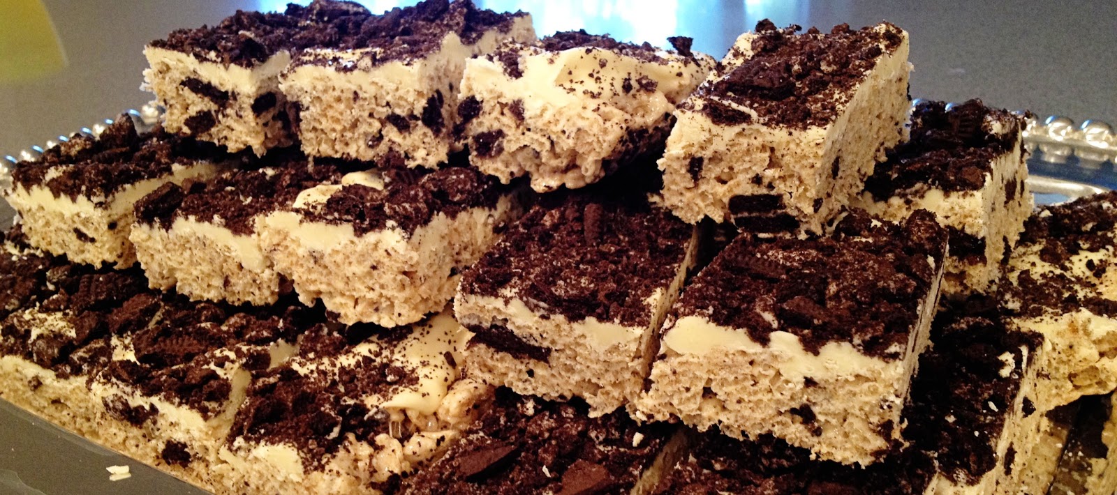 As with most of my great recipes, this one comes from my mom. I can’t think of anyone who doesn’t adore a good Rice Krispie Treat, and this recipe really kicks them up with white chocolate and crushed Oreos…the perfect jazzed up, easy treat that kids and adults go crazy over.